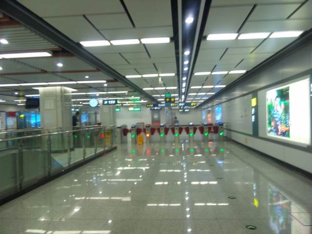 開通したのは長安路を南北に走る「2号線」。現時点では、北は鉄道の西安北駅から南は国際展示場までの16駅区間が開通しています。なので、長安路をバスで走るとあちこちに地下鉄の出入口を見かけます。