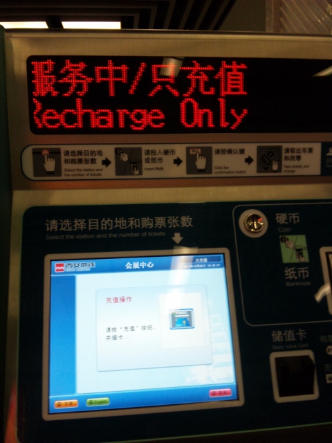 これは、長安通カードのチャージ機です。地下鉄が開通するまでは、バスに乗るために長安通カードをチャージするにも西安銀行(以前の西安市商業銀行)に行くしかありませんでした。しかもこれまた窓口応対のみなので、夕方5時以降はチャージできませんでしたし、最低が30元~(もしかすると今は20元~?)なので、利用頻度の低い人やちょっとだけチャージしたい人にとっては不便でした。