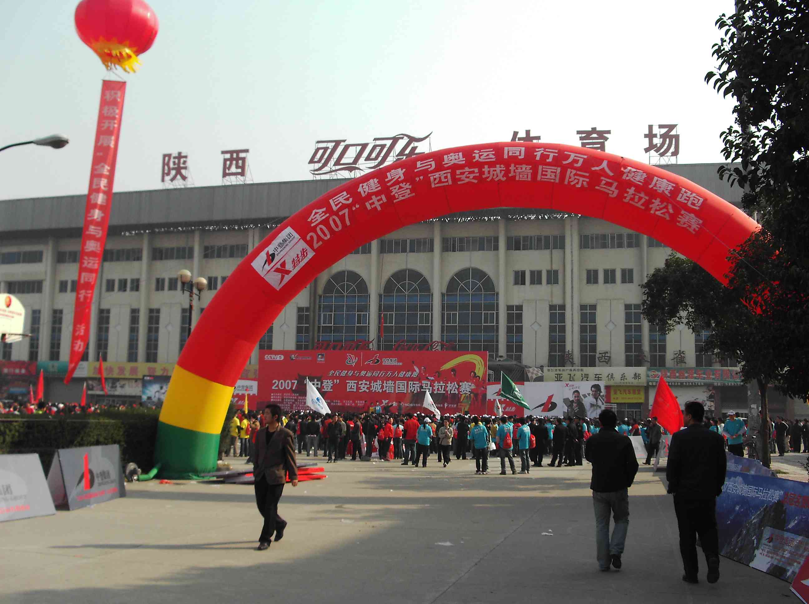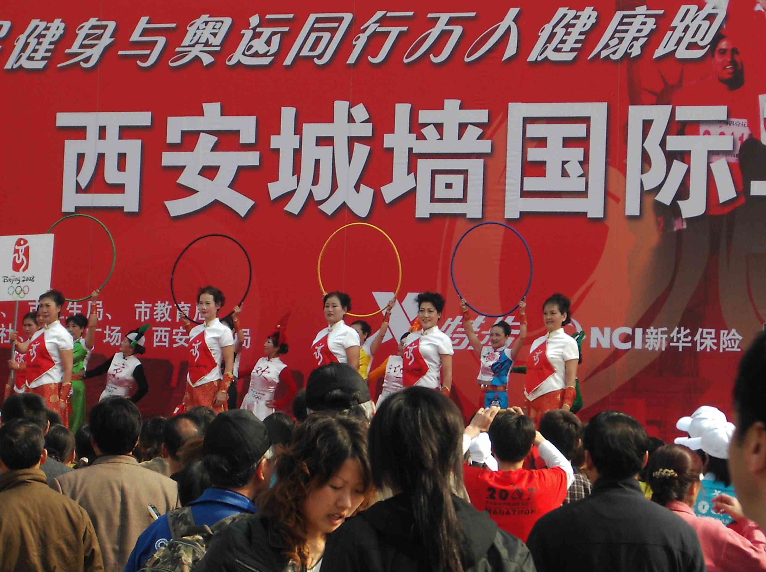 オリンピックの予選になっているのかどうか分かりませんが,一応”国際”マラソンで,「奥運」(=奥林匹克 運動会(オリンピック)の略)の文字も見え,オリンピックのマスコットをあしらった物をかぶったコンパニオンたちがパフォーマンスをしていました。・・・が,まるで緊張感がなく,集まっている人たちと点呼している様子がまるでどこかの町内マラソンのような雰囲気。エントリーが終わるとみんな秩序もなく会場を離れてゆき,誰もウォーミングアップをする様子もなく,ジャージを着ている人も多くはなく,本当にこれからマラソンが始まるのかさえ疑わしい感じでした。
