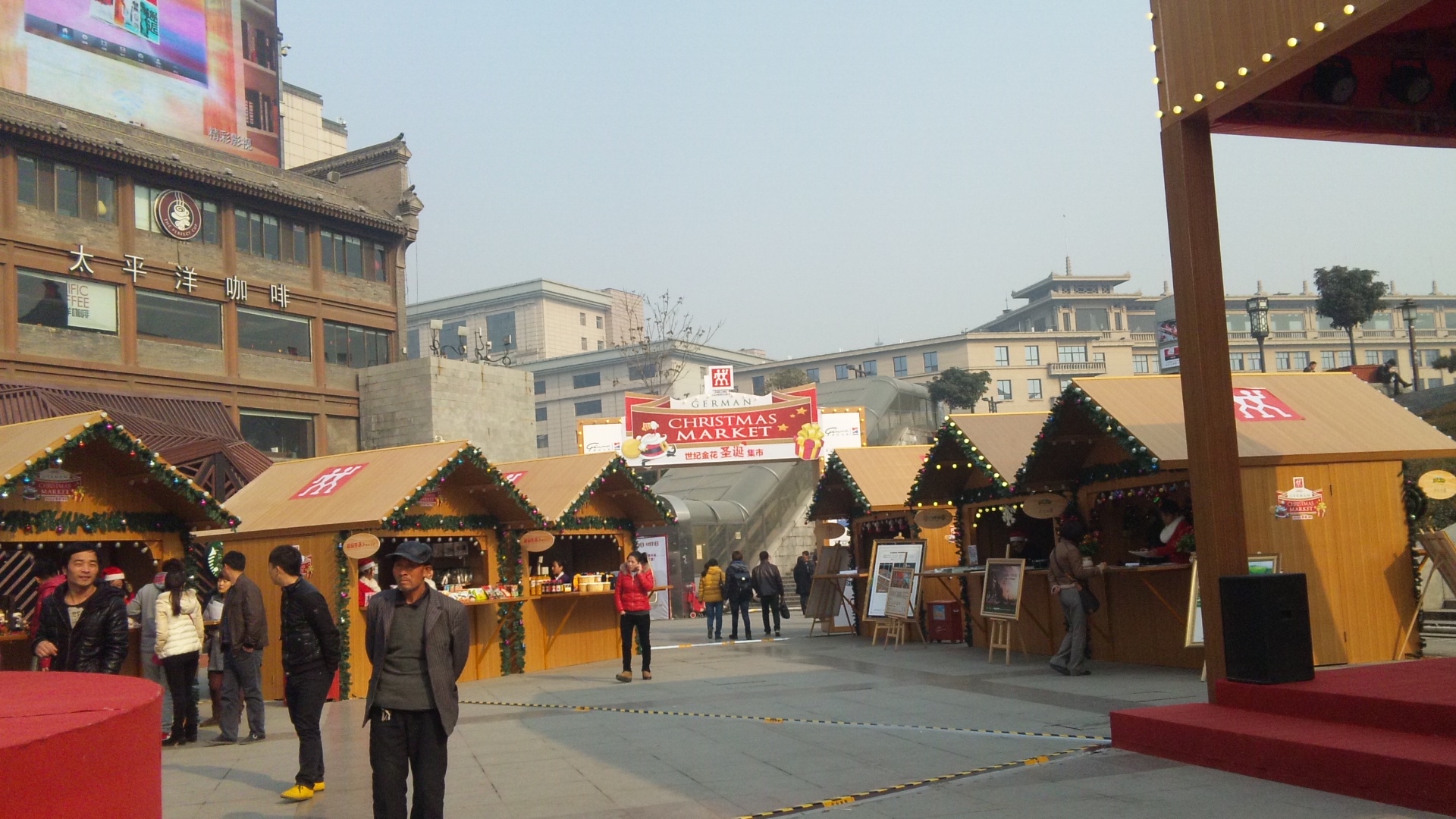 ところで、もう12月。いわゆるクリスマス商戦で、どこのデパートもあの手この手でお客を呼び込もうとしています。鐘楼のそばに「世紀金花」という高級デパートがあるんですが、このデパート、売り場が地下にあるため、鐘楼の地下道に直結しているとはいえ気づかない人も多いようです。地上に看板もあるんですが、一段下がった広場の端にある地下道入口が分かりにくい感じがしていました。それが、久しぶりに来てみると、広場に出店を出してイベントをしてました。