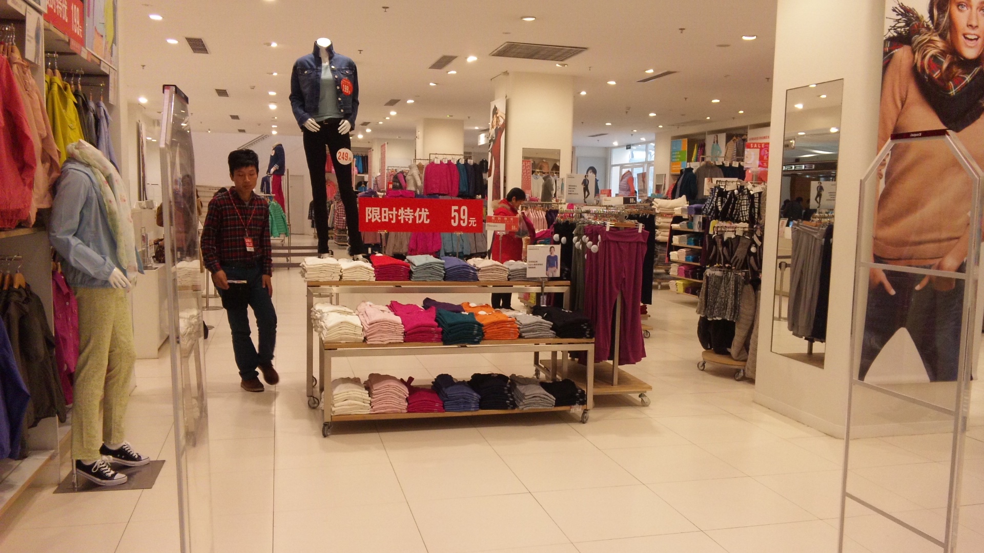 気になるのは商品の質と値段ですが、例えば、この時まだ冬の最中でしたが、メンズのライトダウンベストが199元でした。この頃で2800円くらい(今なら3200円くらい)。モノはと言えば、若干デザインが中国チックでしたが、生地その他の面では日本の同一商品とほぼ同品質でした。