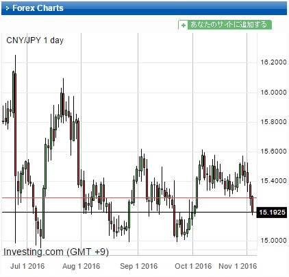 10月初めと下旬に15.5円以上を試していた人民元ですが、一昨日から0.3円以上下落しています。もっとも、外貨全般が軒並み下落し始めているためですが、そのきっかけとなったのは「トランプリスク」でした。