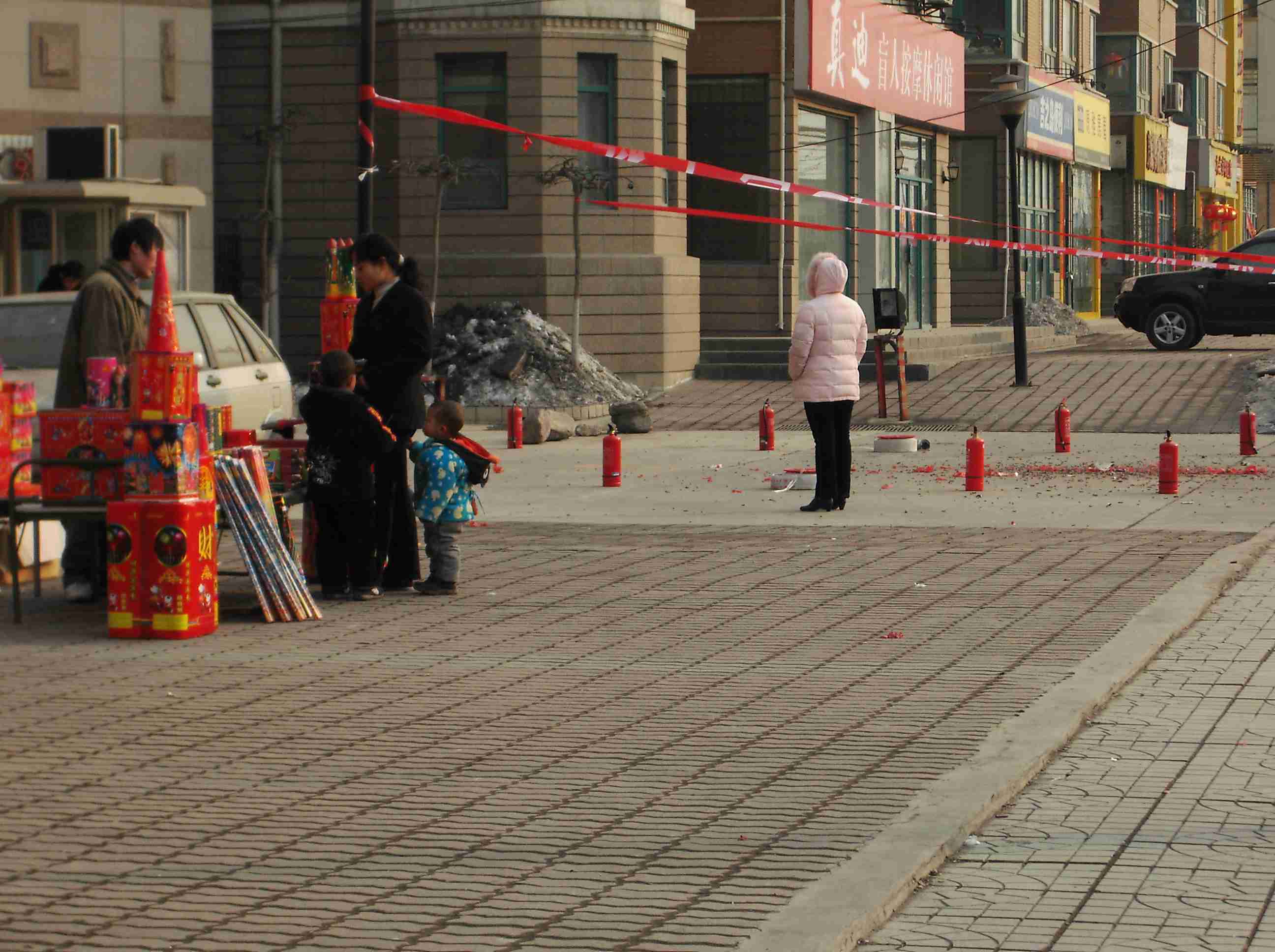 そして,これが360度どこを見渡してもそうなんです。見渡す限り花火と爆竹だらけ。数も横浜の2万発なんて比じゃないでしょう。だって,西安市民だけでも300万人いるんですから。10人に1人が一発ずつ上げても30万発です。もうすごいのなんのって。