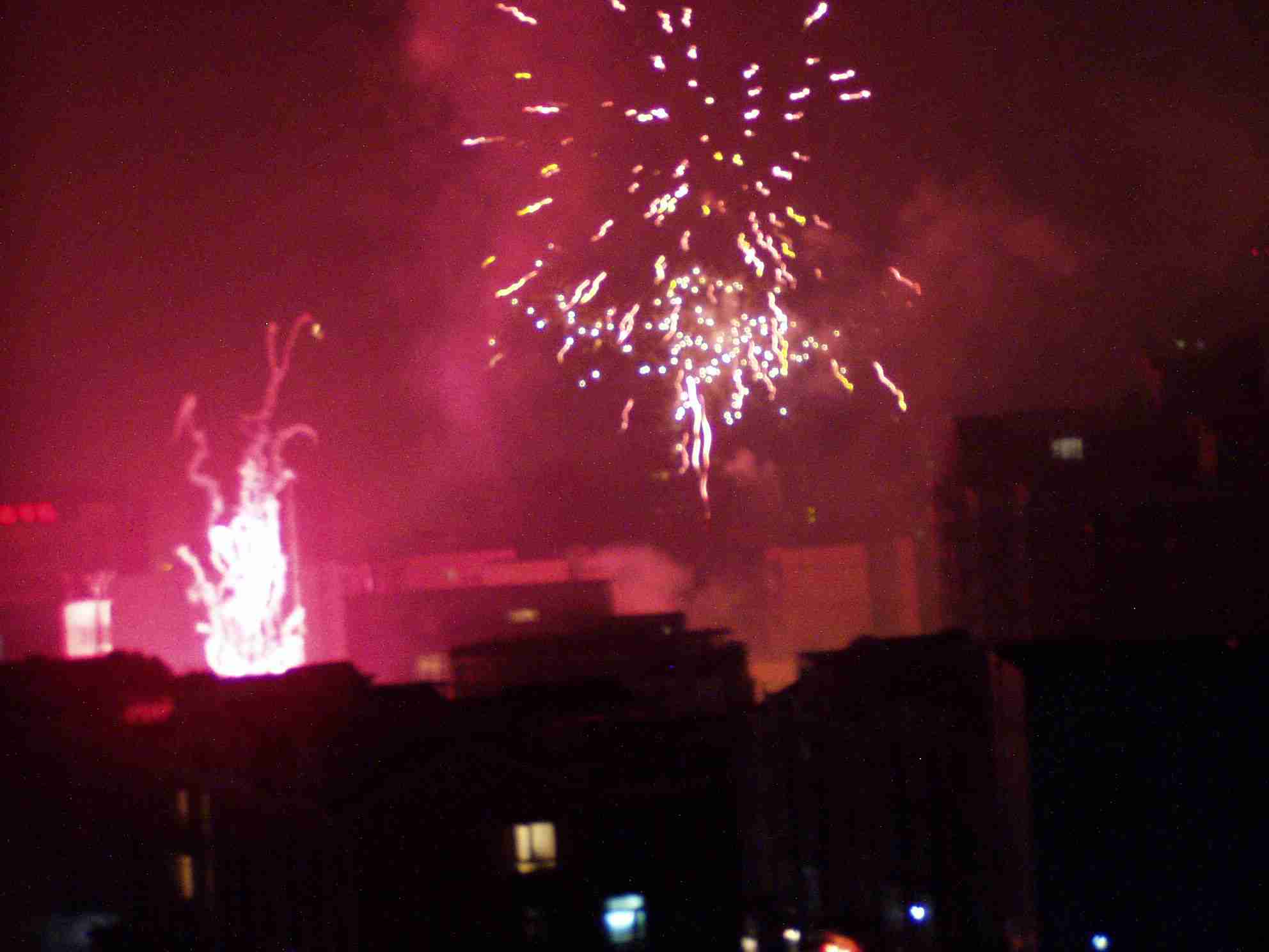 こんな光景になります。どう考えても市街戦が起きているようにしか見えません。爆音もそれはそれはすさまじく体にドーンドーンと響いて来ますし,耳をつんざく爆竹の音も絶え間なく続き,どう聞いても対空砲火と機関銃のようです。あまりの大音量にあちこちの車の防犯装置が作動して,サイレンも鳴り響き続きます。