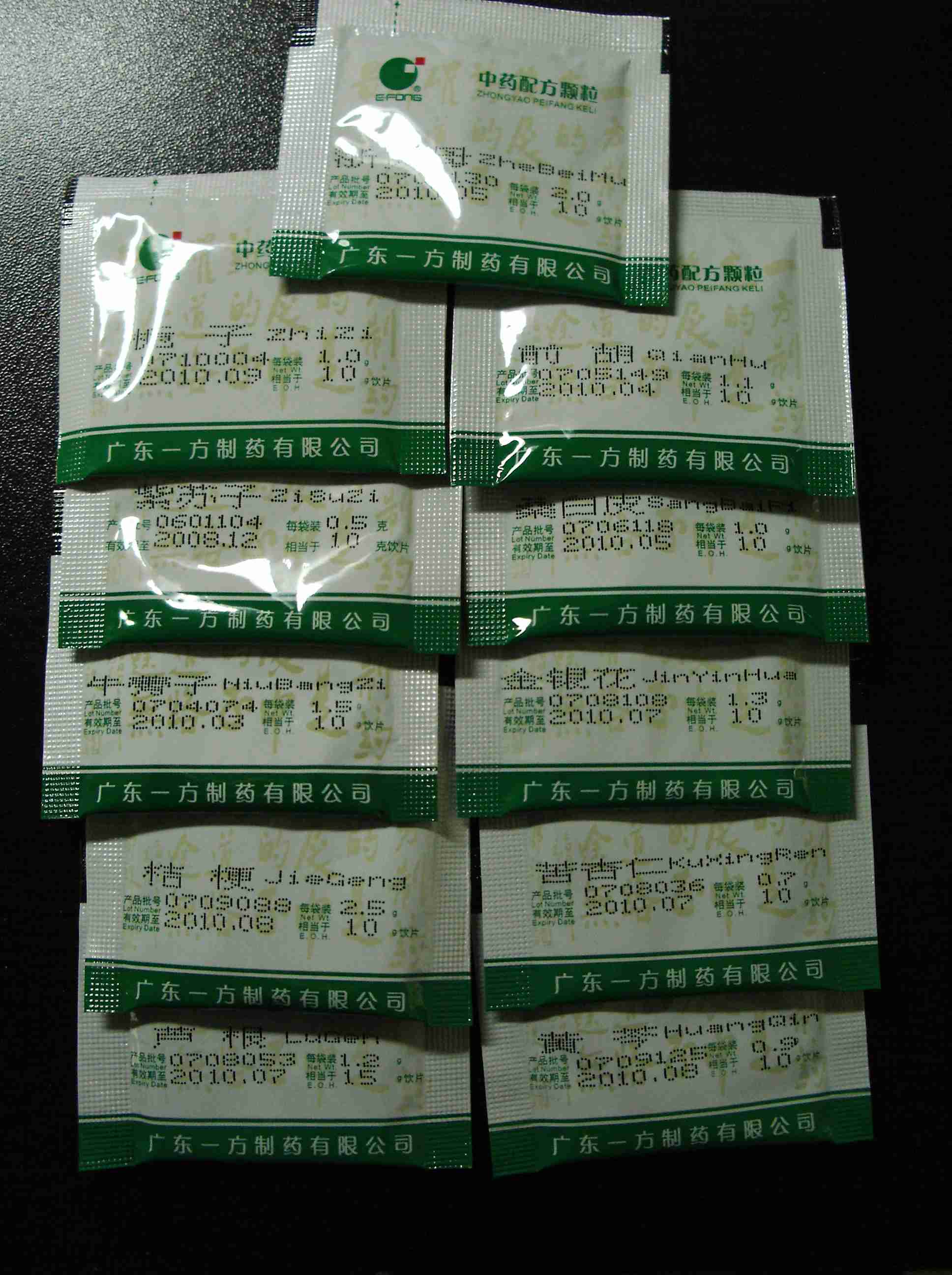 意味が分かるでしょうか?5日分と聞いていたのに,袋はこんなにあります。一体どうなっているのかとよく見ると,それぞれの袋には一種類の薬が入っていました。調剤所のおばちゃんの説明によると,毎回それぞれの袋から一包ずつ取り出して,それらをすべて混ぜて飲むようにということでした。