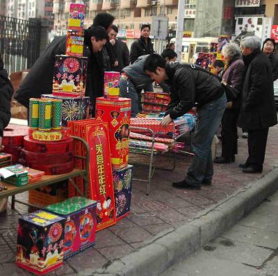 花火と爆竹です。魔除けのおまじないとしてらしいのですが,こちらは皆さんにぎやかなのが大好きなので大量に買い込んで盛大に鳴らします。でも,値段はそんなに安くありません。左下の紺色の箱は三層花火ですが,90元(1,400円ほど)でした(あなたには60元(800円ほど)で売るよとか言われましたが…)。爆竹も一束25元(380円ほど)です。普段5元(80円ほど)の麺を食べている人たちが,花火と爆竹にはお金を惜しみません。リサーチ会社「北京中観経済調査公司」によると,北京では春節期間中における市民1人当たりの平均支出予想額は3766元(約5万6000円)とか(Yahoo!ニュースからの引用)。みんな豪華料理と花火と爆竹に消えます。都市部の平均月収は1,000〜2,000元くらいなので,2,3ヶ月分の給料をはたく感じです。それほど春節は中国人にとって大事なんですね。