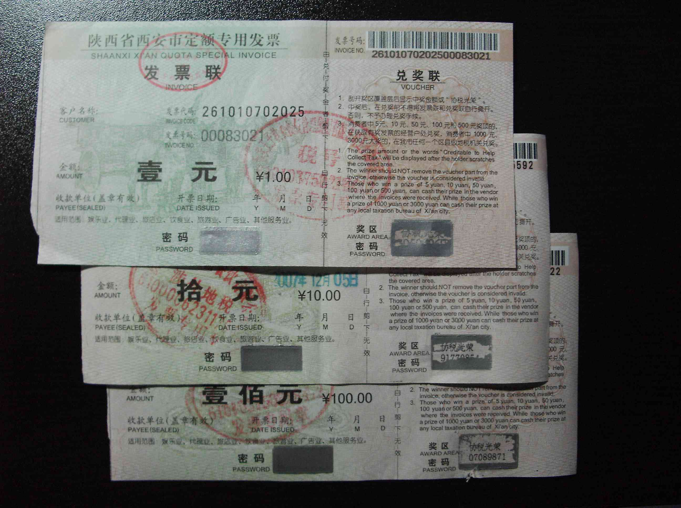 賞金には,5元,10元,100元,500元,1,000元,3,000元の7種類あり,500元以下ならその場でもらえて,1,000元以上はお役所からもらえます。