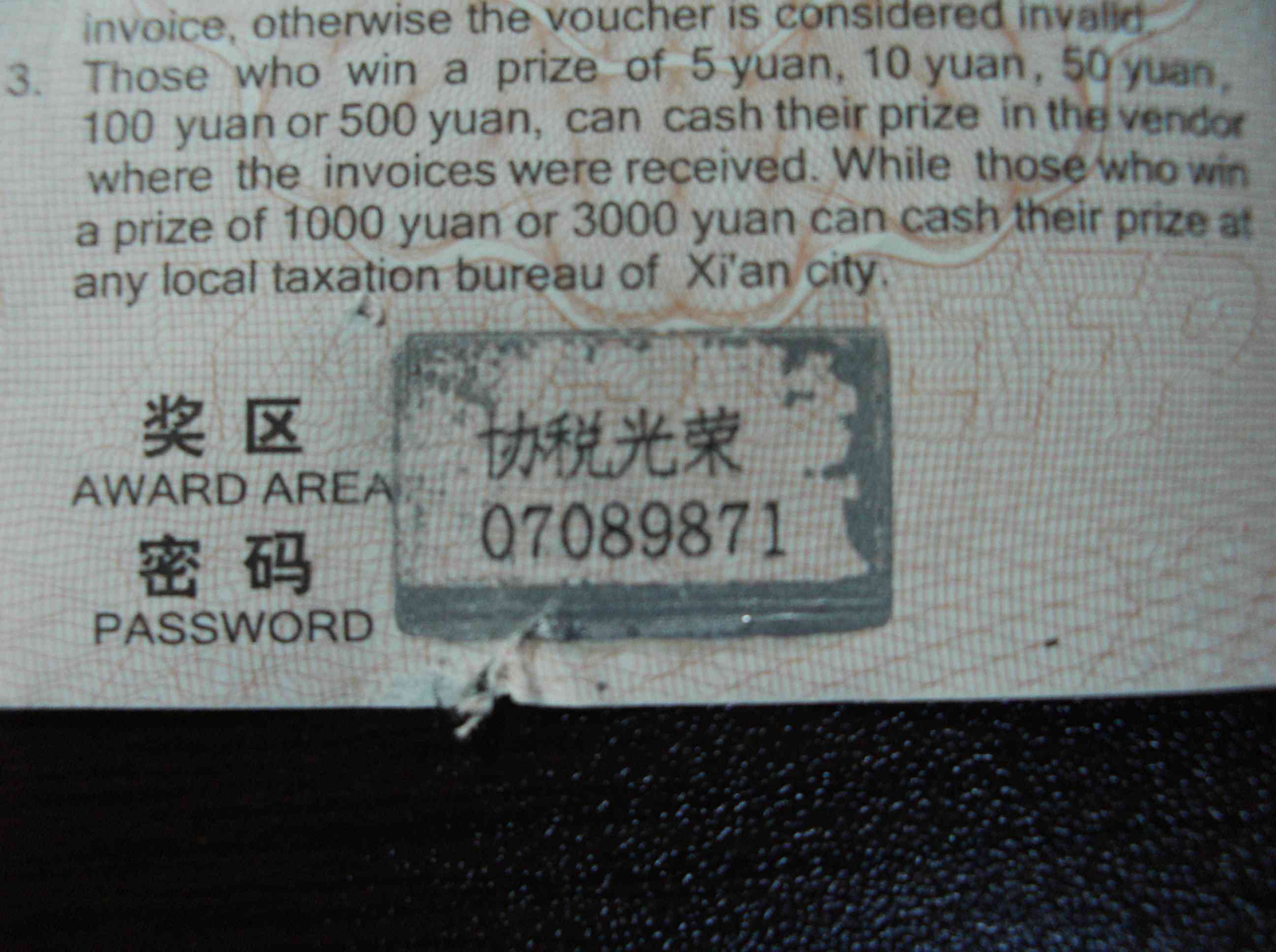 例えば,飲食店で何かを食べてお金を払う際に”ファーピャオ”と言います。すると,お店側は金額に応じてこの券をくれます。この券の右下にスクラッチがあるので,それをただちにこすります。すると…
