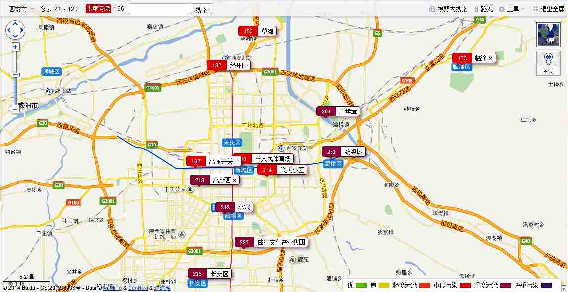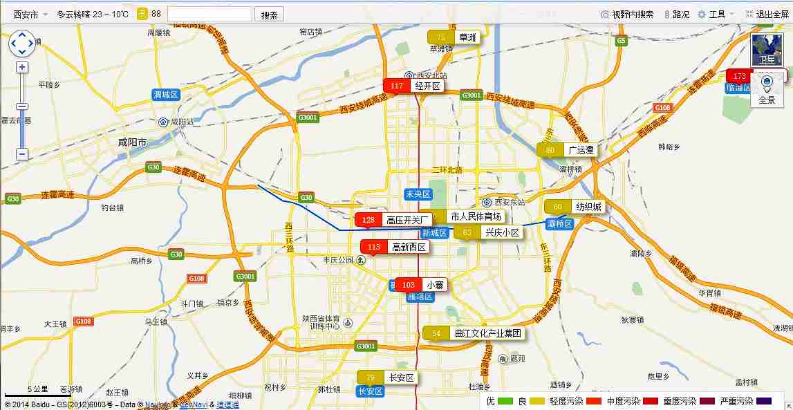 上の図は10月22日夕方のものですが、赤色は中度の汚染、紫色は重度の汚染で、西安の南側と東側が比較的深刻であることが分かります。風向きのせいなのか、南側のほうが地下鉄の整備が遅れていてバスなどの交通量が多いせいなのか、原因はよく分かりません。