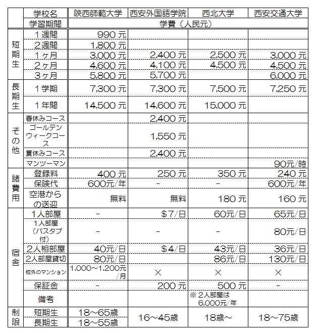 さて、前置きはこれくらいにして、本題の西安留学です。どの大学を選んだらいいのでしょう?そこで、西安の代表的な留学先4大学について簡単にまとめてみました。下の表を見てください。主に留学期間と学費という観点からまとめてあります(クリックで拡大表示できます)。