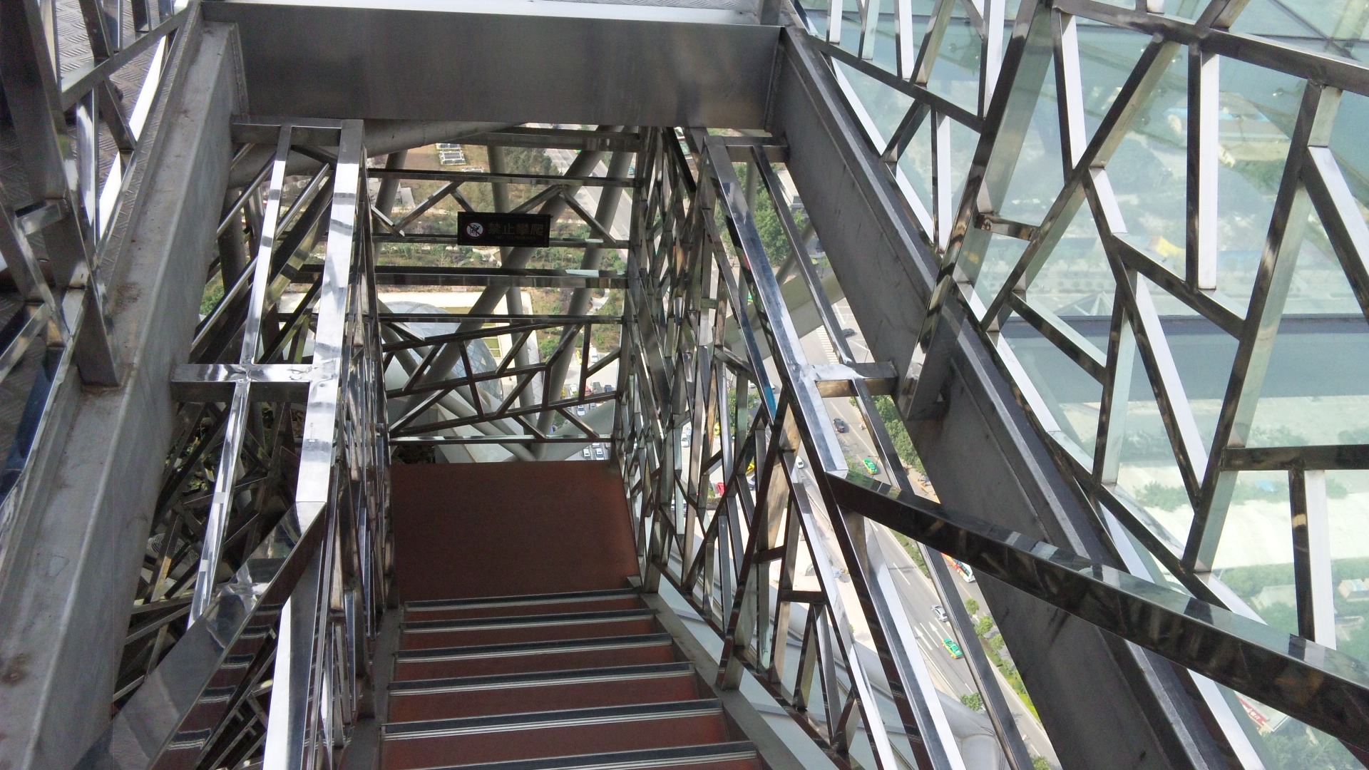 しかも、むき出しにもかかわらず、単なるスカスカの非常階段同様で、下も横も隙間だらけ。一応安全な仕組みにはなっているものの、前を上っていたおじさんは高所恐怖症らしく、足がガクガクになりながらなんとか上っていました。景色を直接見られるのはいいとしても、何か物を落としたら大変です。道理で荷物を預けさせた訳です。