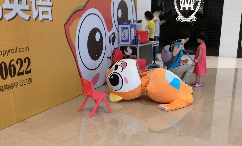 このイベントに、この塾のマスコットキャラクターの着ぐるみも出たようですが、ここ数日の暑さにヤラれてか、脱ぎ捨てられて、こんな無残な姿になっていました。